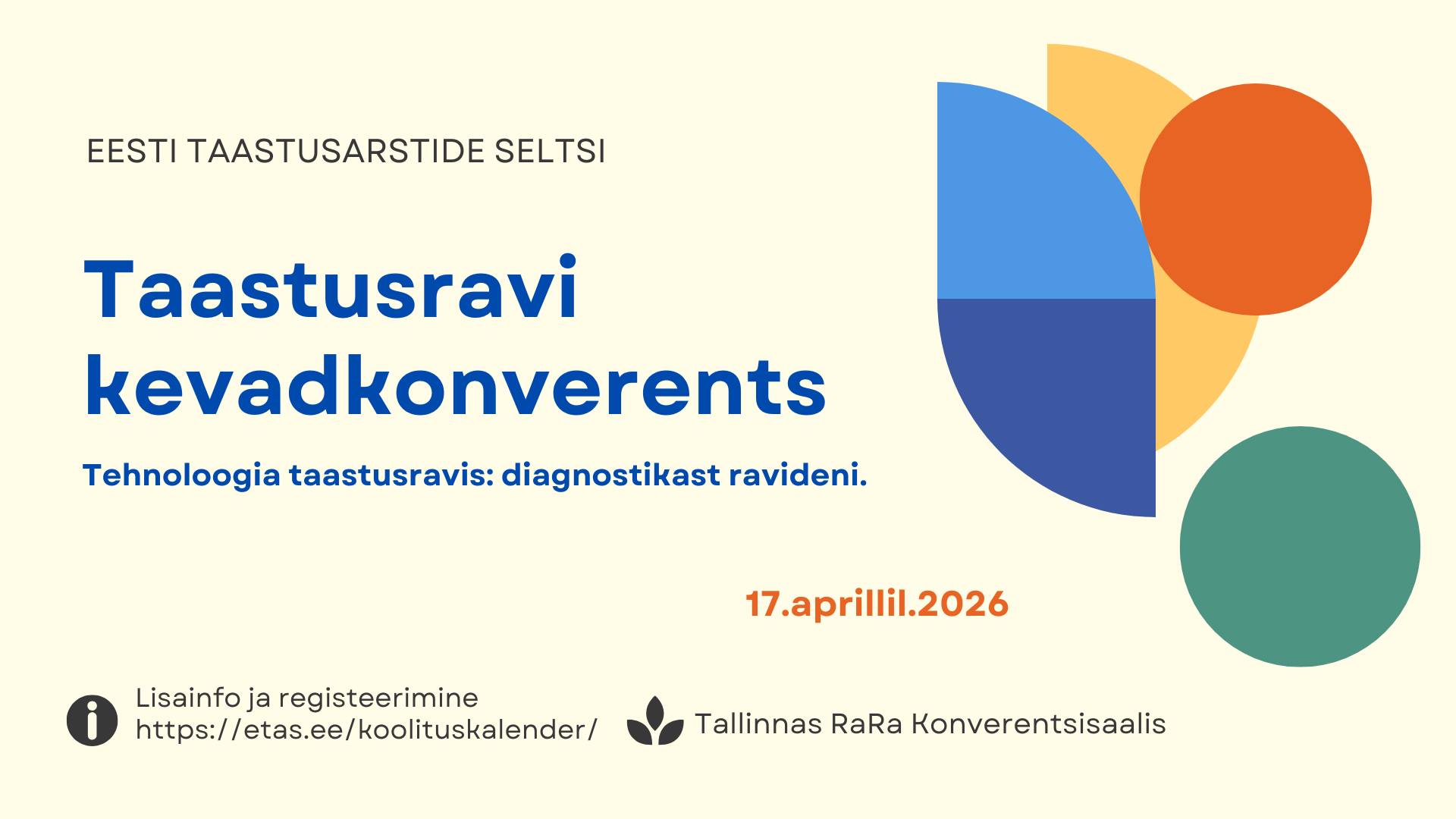 17. aprill 2026 Tallinn Taastusravi Kevadkonverents 2026. Tehnoloogia taastusravis: diagnostikast ravideni Toimumiskoht: Eesti Rahvusraamatukogu konverentsisaal Tallinn Tõnismäe 2, www.rara.ee Osalustasud: ETAS liikmetele ja residentidele 40 eur, üliõpilastele 30 eurot,  tavapilet 60 eurot Osavõtutasu kanda Eesti Taastusarstide arveldusarvele EE022200221020164763 Swedbankis. Palun lisada selgitusse kindlasti Kevadkonverents ja osaleja NIMI Päevakava ja registreerumine: https://forms.gle/uUXZAKxLWKLX4k6TA
